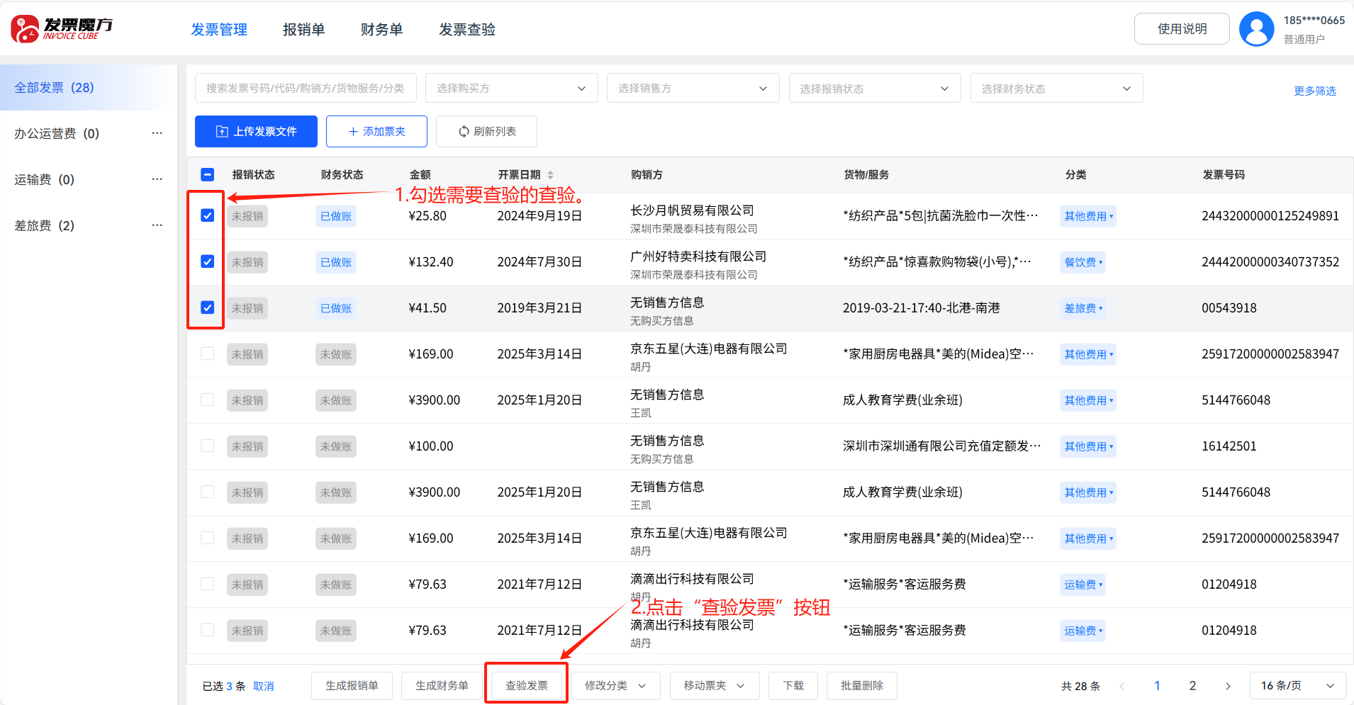 1.批量查验 进入 “发票管理”*页面。 勾选需要查验的发票,点击页面功能按钮中的 “查验发票”,即可批量发起校验。