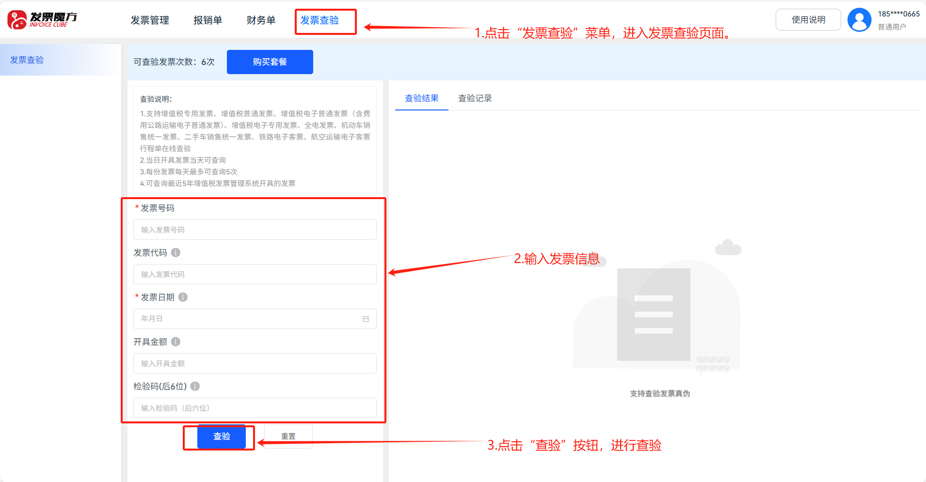 2.单张发票查验 进入“发票查验”独立页面。 手动输入待查验发票的相关信息,点击 “查询” 按钮,完成单张发票的校验。