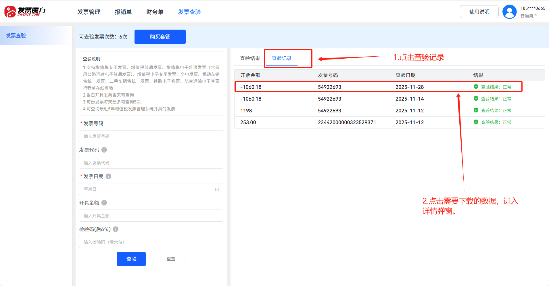 仅当查验结果为正常时,支持下载发票明细信息,操作步骤如下: