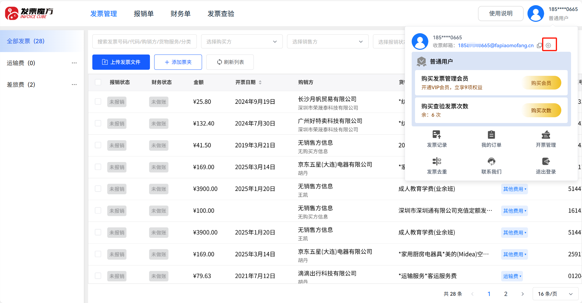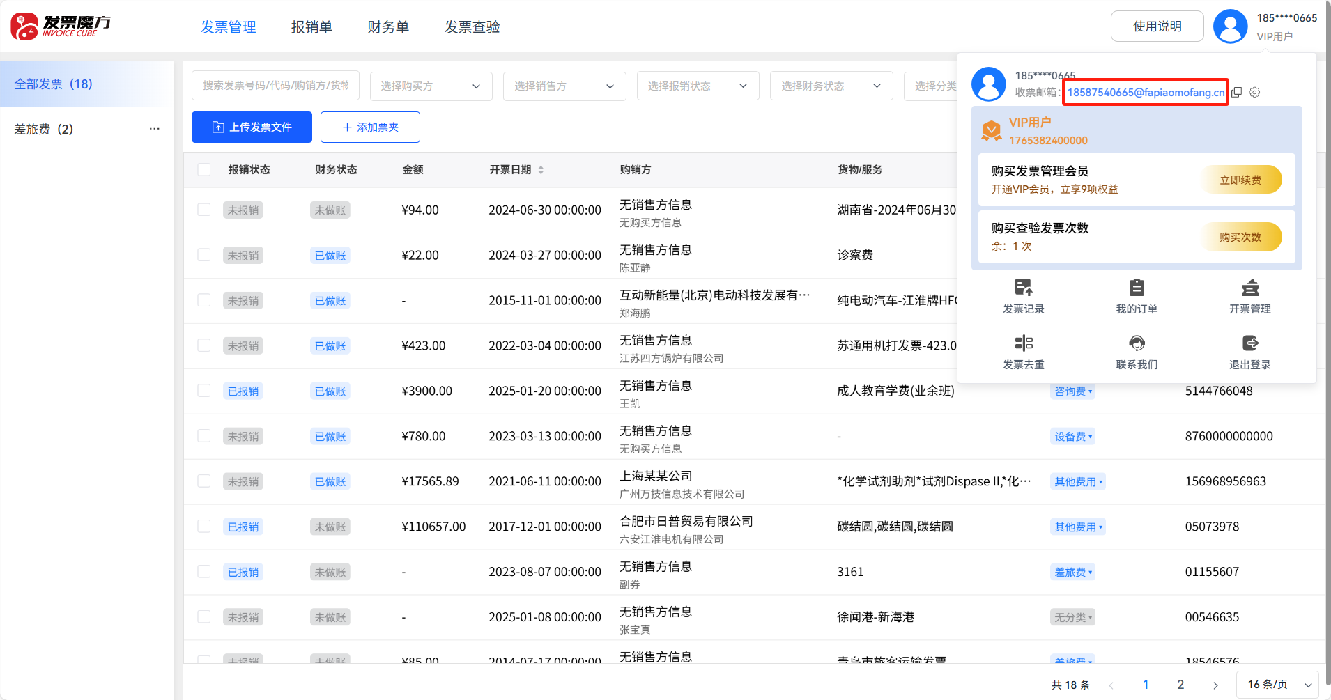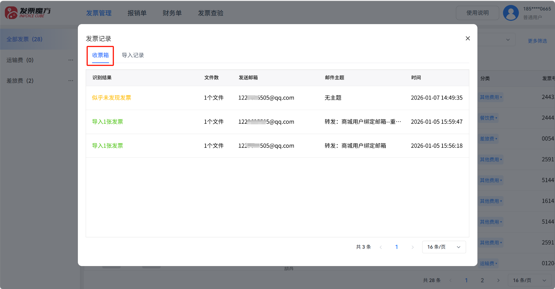 用户完成发票魔方注册后,系统将自动生成专属收票邮箱,格式为:手机号+@fapiaomofang.cn