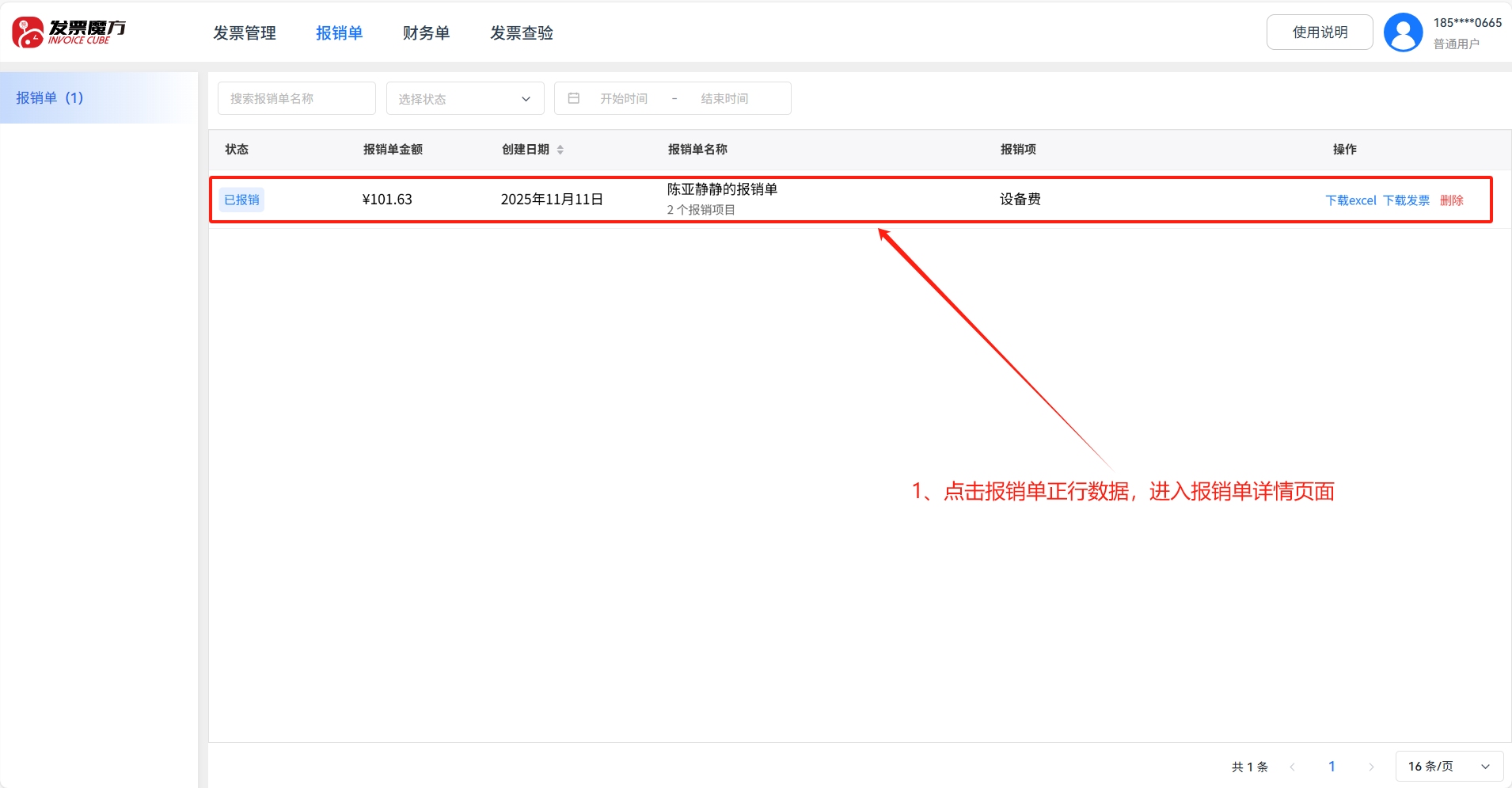 2.查看报销单 点击功能区的 “报销单”选项,即可查看所有已创建的报销单列表。