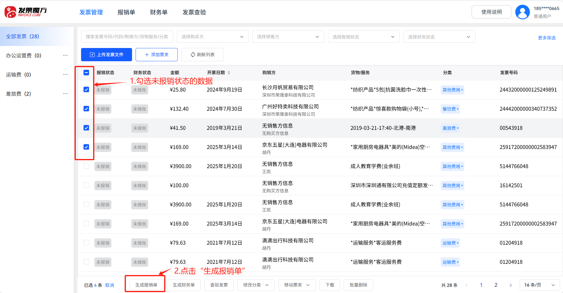 1.生成报销单 进入 “发票管理”*页面,勾选状态为 “未报销”的目标发票,点击“生成报销单”按钮,即可将勾选的发票整合为一个新的报销集。