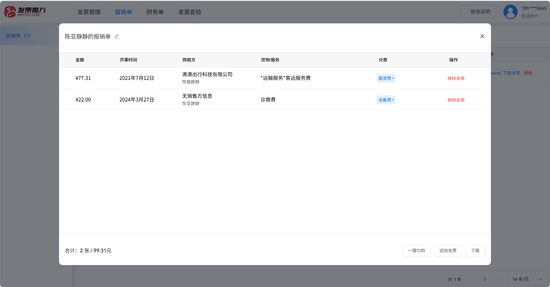 3.报销单详情操作 点击列表中的任意一条报销单,弹出详情弹窗。 在弹窗内可查看该报销单包含的所有发票信息。